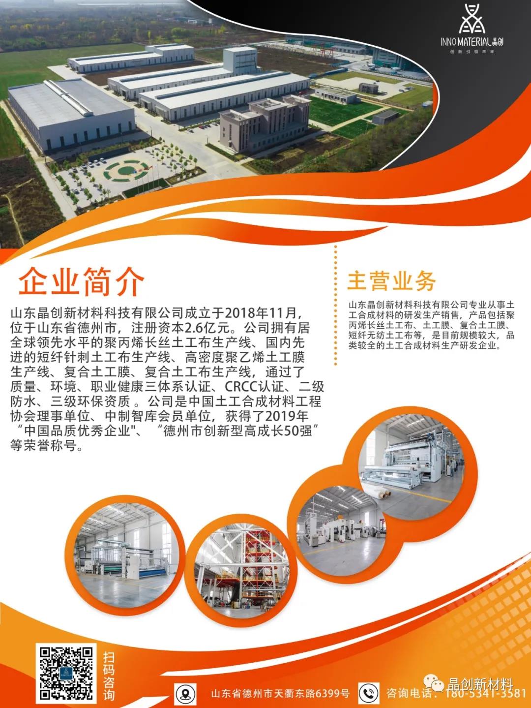 2021年7月14日、8月6日,在中國檢驗認證中心有限公司(CRCC)所發布的2021年(總第514號)和第31號(總第518號)認證公告:山東晶創新材料科技有限公司所生產的土工膜和土工布連續獲得4份CRCC認證證書。分別是土工膜類:高密度聚乙烯土工膜(證書編號:CRCC10221P13540R0M-002),無紡布復合土工膜(證書編號:CRCC10221P13540R0M-003);土工布類:短纖無紡土工布(證書編號:CRCC10221P13540R0M-001),聚丙烯長絲無紡土工布(證書編號:CRCC10221P13540R0M-004)。