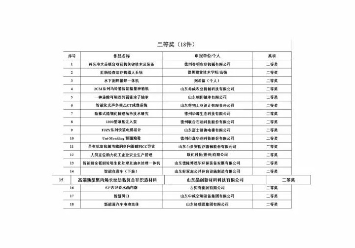 2021年11月24日,德州市人民政府公示了 德州市首屆“市長杯”工業設計大賽獲獎名單,山東晶創新材料科技有限公司榮獲二等獎,作品為“高端新型聚丙烯長絲紡粘復合非織造材料”。